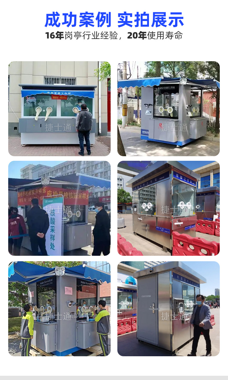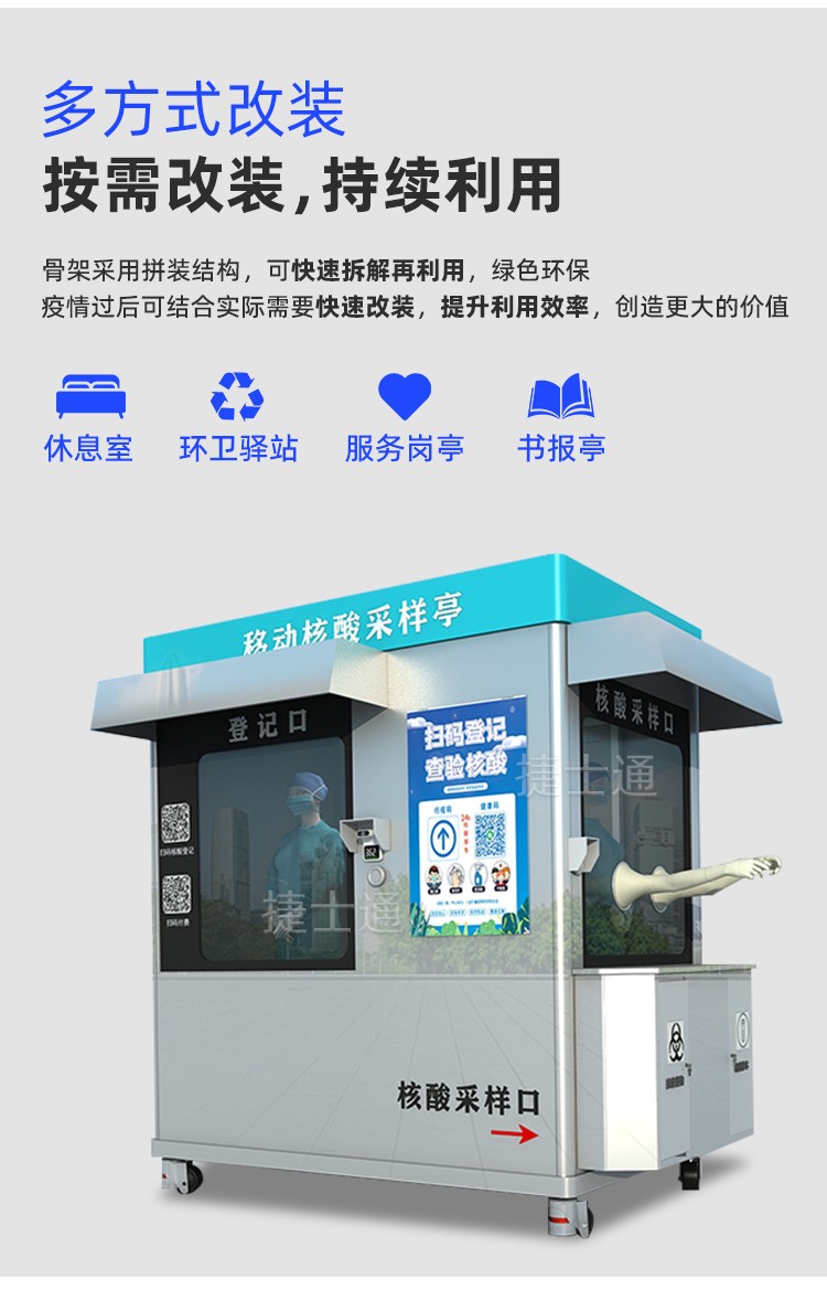 疫情過后可綜合實際需求核酸采樣亭改裝成休息室,環(huán)衛(wèi)驛站,服務(wù)崗?fù)?,書報亭,保安崗?fù)ぃ圬浲?,垃圾房等,提高利用效率,?chuàng)造更大價值