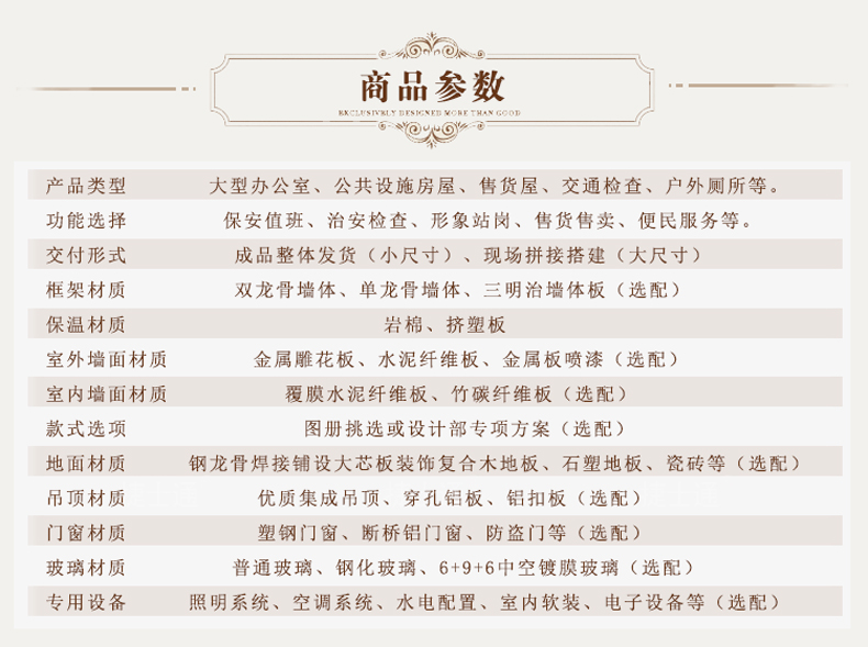 產(chǎn)品類型 大型辦公室、公共設(shè)施房屋、售貨屋、交通檢查、戶外廁所等。