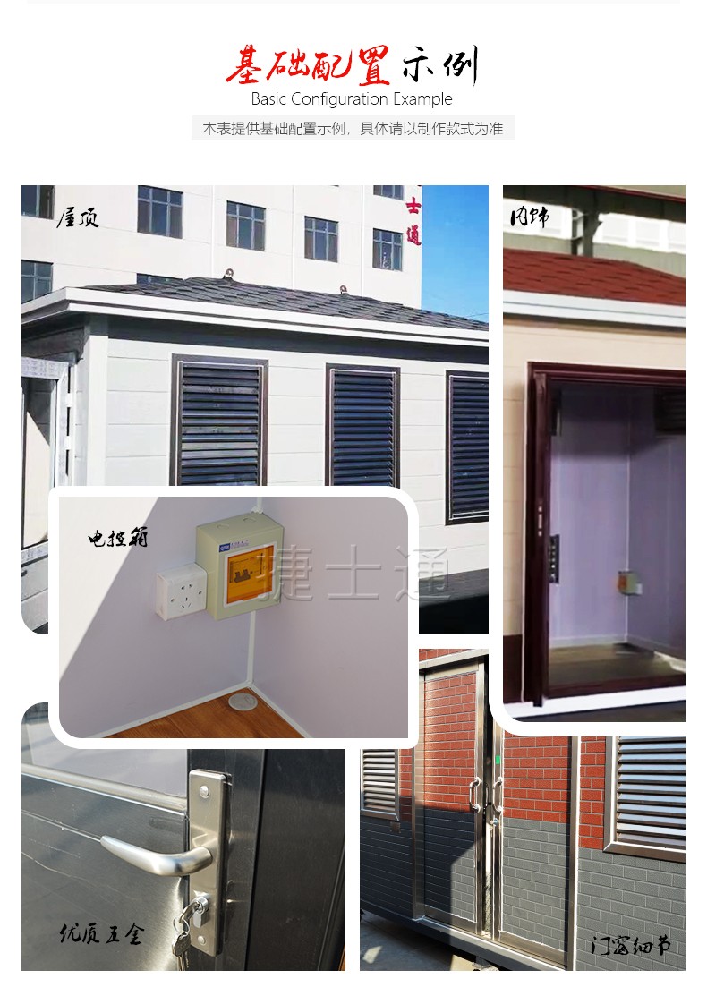 標準配置:墻體含保溫材料,屋頂鍍鋅板靜電噴涂,PVC吊頂,墻體顏色及門窗類型均可按需定制,地板可定做防滑鋁板/復合木地板,電箱、開關、插座、暗敷電線、照明燈、桌面、抽屜、鍵盤托、空調架等。