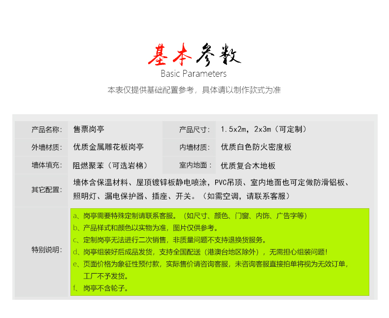 | 類型 | 售票亭 | 顏色 | 可定做 | 運輸方式 | 公路運輸 | ||